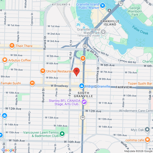 The local bus #99 runs along Broadway stopping at Granville and Broadway. The office is a short walk around Fir to 8th.
